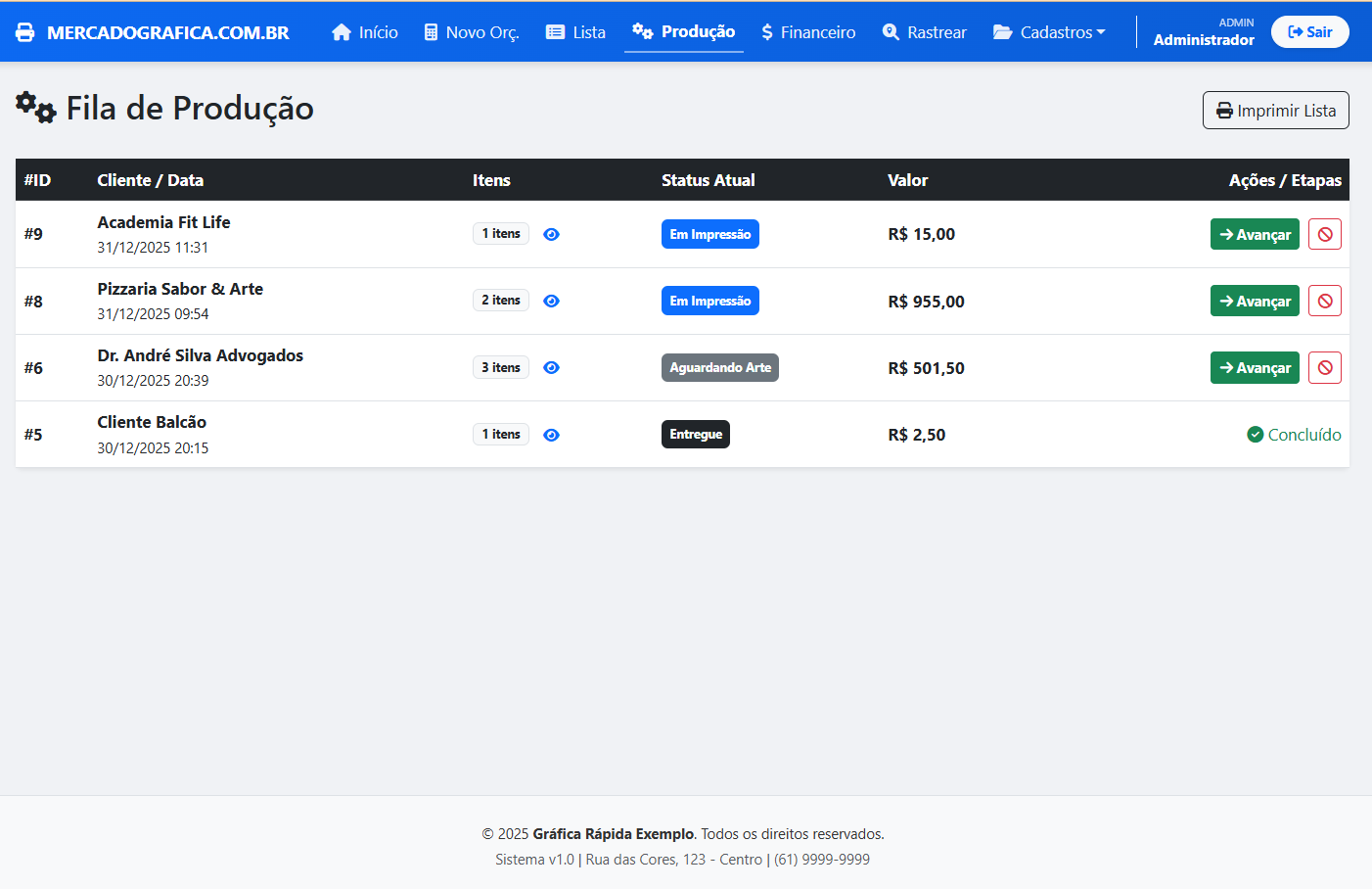 Saiba o que imprimir, o que está no acabamento e o que está pronto para entrega.